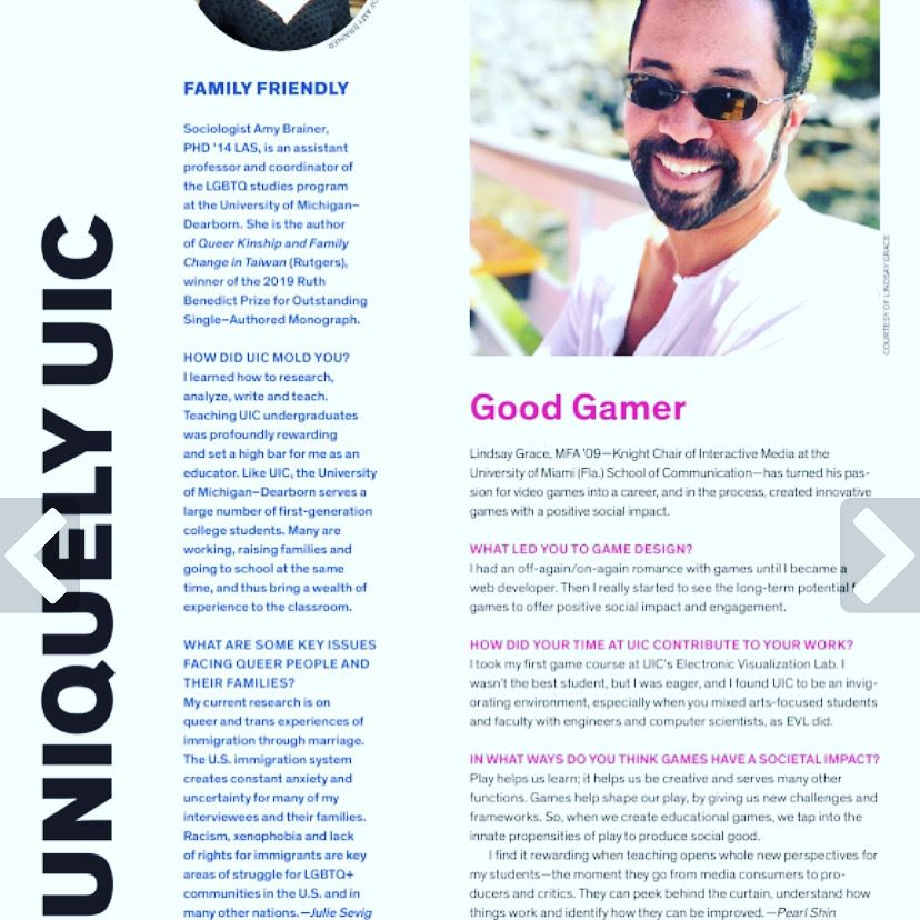 - 2020: Featured: University of Illinois-Chicago alumni magazine, Good Gamer-Uniquely UIC, page 38, Staff, Spring, 2020