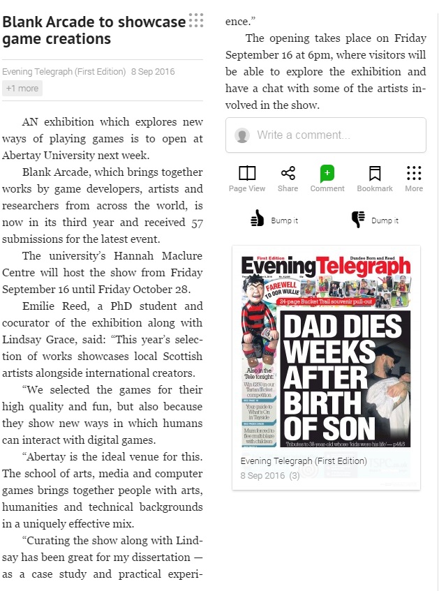 - 2016: Quoted, UK Telegraph, Blank Arcade to Showcase Game Creations, September, 8 2016
